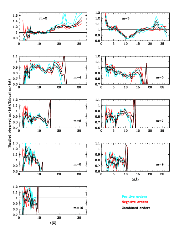 Count ratios (mth order divided by 1st order) are computed by first applying the pile-up corrections determined within each tg_mlam slice to each of the 0.0125/m-Å bins in the observed spectra. (Binning for SPECRESP is the same.) The observed spectra and SPECRESPs for each order are then rebinned in tg_lam space so that mth/1st ratios can be computed. In order to correct for dither across missing columns (which is accounted for by SPECRESP, also referred to as the "model"), the ratios actually used to tune the pile-up parameters and derive final results are [observed(m)/observed(1)]/[model(m)/model(1)]. Statistical errors are computed for the observed spectra and 10% (15% for ObsID 1701) of the net pileup correction is added to each order's error (simple addition, not quadrature) before finally computing the total ratio uncertainty in quadrature.