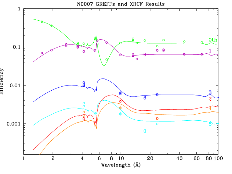 Fig. 3 includes all available results for pre-flight XRCF calibration of higher orders. Thick circles denote ratios using the XRCF-measured 1st order efficiency while thin circles denote normalization to the GREFF ("model") 1st order. The points near 4 Å are from Ag-L, which has a complex line and absorption-edge structure resulting in large systematic uncertainties. Systematic uncertainties for the Fe-L points near 17.5 Å (for 3rd and 5th order) should be smaller. Errors for Mg-K (10 Å) and O-K (24 Å), which have relatively simple emission-line and filter-absorption spectra, should be even smaller but the difference between the model and observed 1st order efficiency for O-K is obviously quite large. Because the XRCF calibration for higher orders (see Fig. 11) has such sparse wavelength coverage and its uncertainties are larger than those in the present work we did not give the XRCF results any weight in deriving our final results.