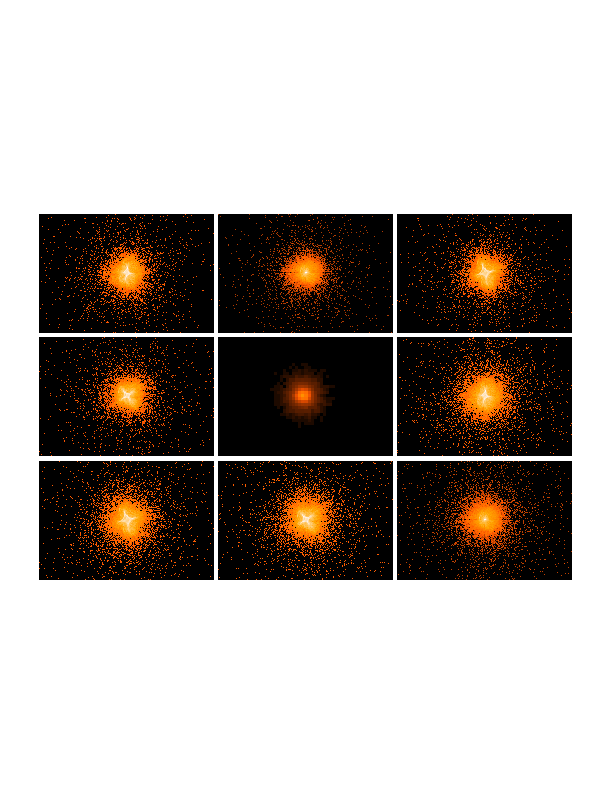 A vivid demonstration of the coarseness of interpolation is given in Figure 1 which shows the 8 files that mkpsf uses to obtain the PSF shown in the center. These files are the PSF model images in hypercube 4 at the four corners surrounding the desired location (THETA=0.5 arcmin, PHI=0), for two energies in the grid (1.4967 keV and 4.5 keV).
