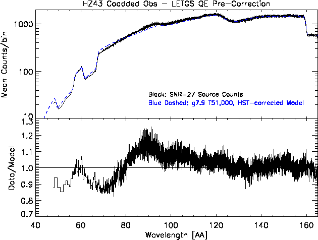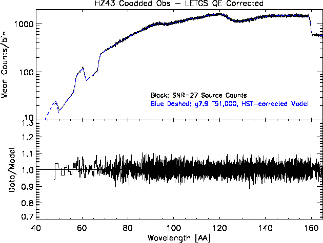 - LETGS QE corrected (vN0011): The fit and residuals to co-added spectra for HZ43 taken since launch, with the new HRC-S QE (version N0011).