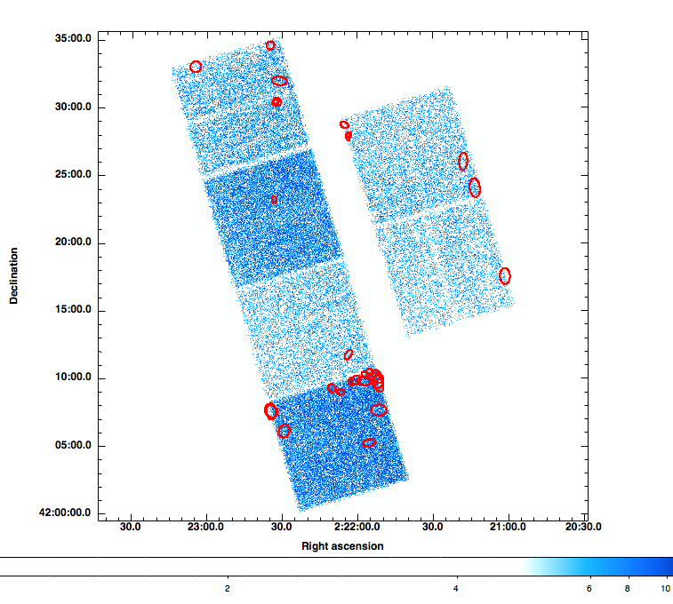 Figure 7: An example simulated event list using the metadata for obsid 4613. A total of 25 simulation runs were performed for this obsid, yielding 30 source detections that passed CSC inclusion criteria. These detections are shown in red.
