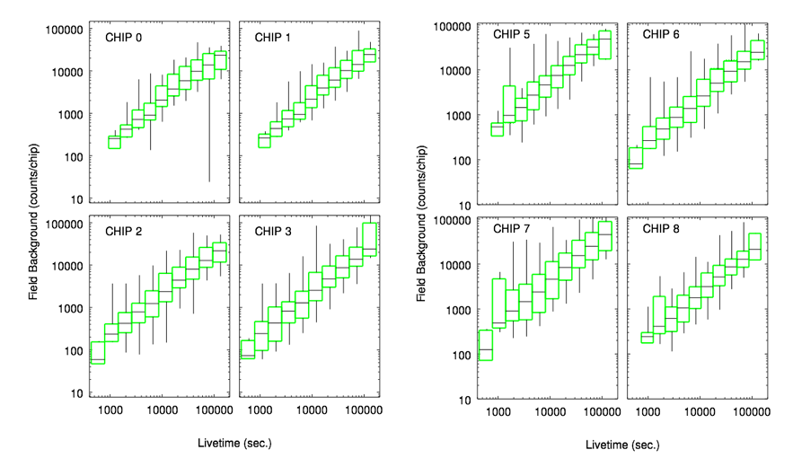 Figure 4: Field background per chip vs. livetime for commonly used ACIS imaging chips, estimated from CSC event lists with source contributions removed. Median backgorund counts per bin are indicated by horizontal lines. Boxes include 95% of the measurements in each bin, and vertical lines indicate extreme values.