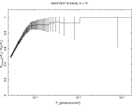 A limiting sensitivity map is computed for each obsid that contributes to the CSC, in each of the 5 science energy bands. The maps are derived from the CSC model background maps for the obsid, randomized to the appropriate statistics for the observation. Each sensitivity map pixel represents the minimum point source photon flux needed to yield a flux significance greater than or equal to the catalog inclusion limit (3σ) at that location, when background is obtained from a region in the randomized background map appropriate to background apertures at that pixel location. An example sensitivity map is shown in Figure 5.