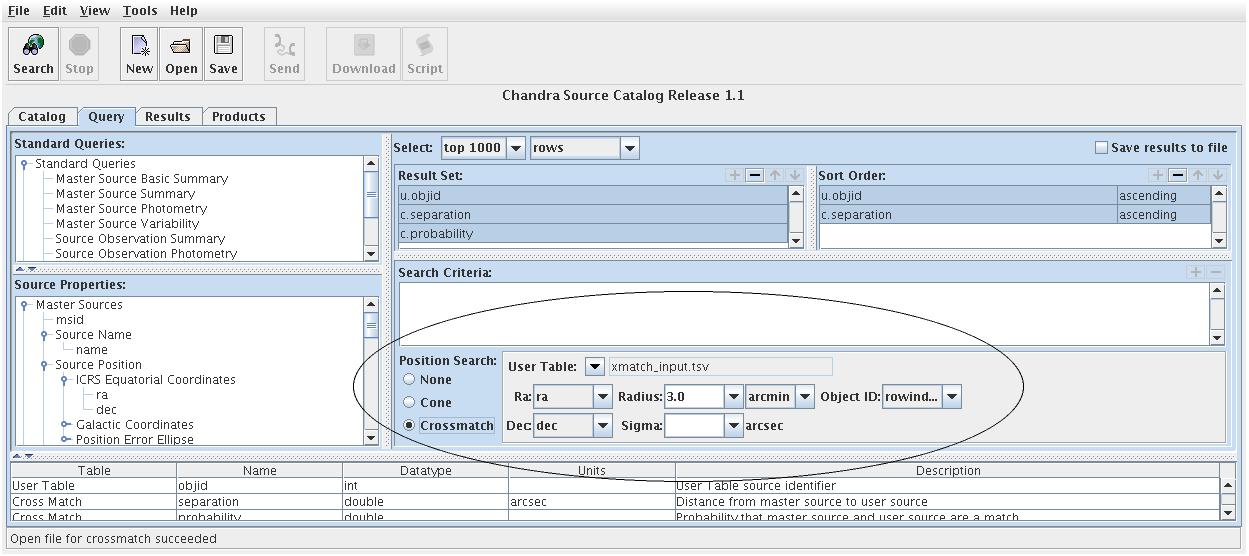 CSCview now features a crossmatch function which allows you to locate CSC counterparts to sources of interest by uploading, transmitting, or directly entering a table of source positions (and optionally, position errors) to the GUI. To use the CSCview crossmatch, launch CSCview from the CSC homepage and select "Crossmatch" in the lower-right corner of the Query tab. For help using the crossmatch, refer to the CSCview help page.