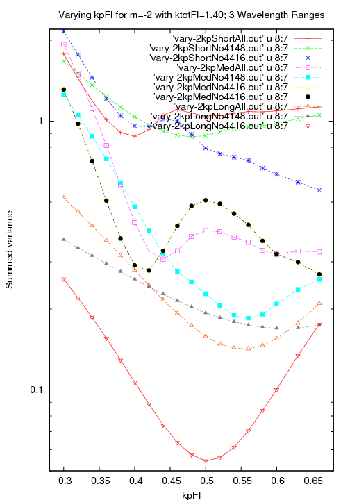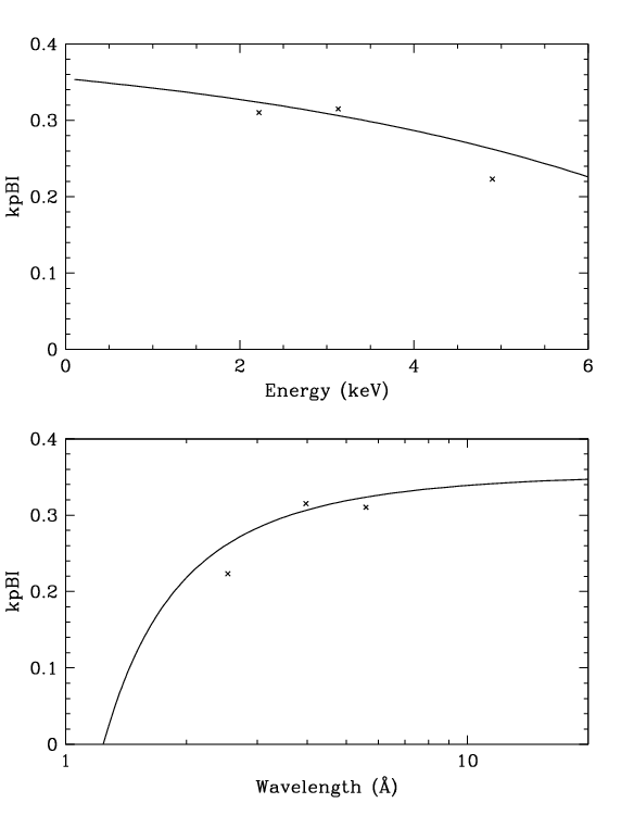 | Figure 1 (ps, pdf): Best ktotFI=1.40. Short-wavelength results are off-scale but are included in this extended plot: (gif, ps, pdf). | Figure 2 (ps, pdf): Best kpFI=0.41 (Short), 0.42 (Medium), and 0.51 (Long). | Figure 3 (ps, pdf): Best ktotBI=1.53. | Figure 4 (ps, pdf): Best kpBI=0.223 (Short), 0.315 (Medium), and 0.310 (Long). Results when negative pile-up-corrected rates are forced to zero are distorted (gif, ps, pdf). |