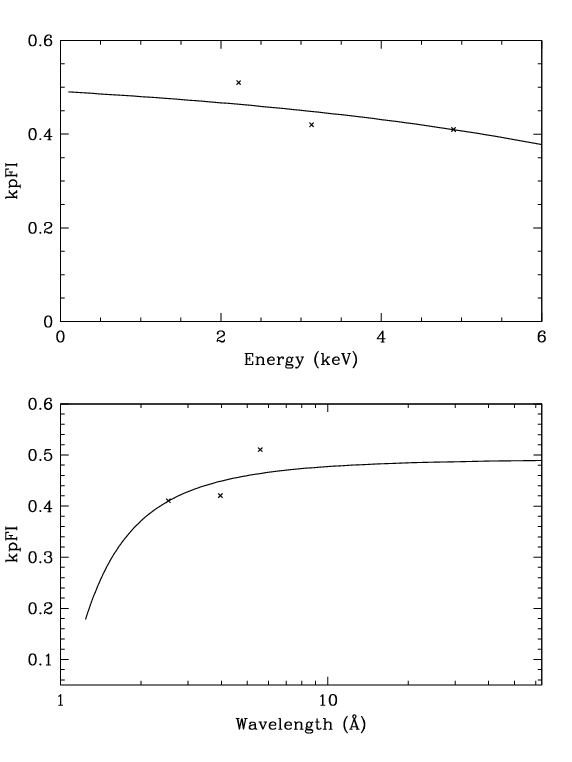 No significant energy dependence was seen in the value of ktot in our wavelength range of interest and the values for the FI and BI chips were set to 1.40 and 1.53, respectively. kp tended to decrease toward shorter wavelengths, which is physically reasonable since the charge clouds deposited by higher-energy photons become larger, activating more pixels in the 3x3 island and therefore causing a higher fraction of grade-migration event losses. (The LSF also broadens toward short wavelengths and a higher fraction of cross-dispersion orders is included within the extraction region, making the collapsed 1-D event rate higher than it "should" be.) Results are shown in Figs. 5 and 6, along with smooth curves that attempt to capture the energy dependence. Uncertainties on the data points are difficult to estimate, and the main consideration in making those curves was to pass near the Long and Medium wavelength results. The true values of kp at the shortest wavelengths are probably smaller than indicated by the curves. Values at longer wavelengths (λ > about 6 Å) are assumed to be close to the "Long" values; any errors there are less important than at λ < 6 Å because 1st-order event rates and therefore pile-up corrections are smaller. The kp values listed below are the long-wavelength asymptotic values used in the energy-dependent version of the pile-up-correction program.