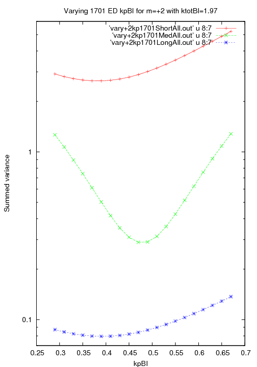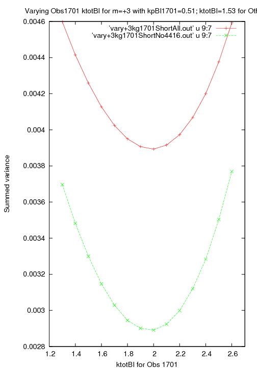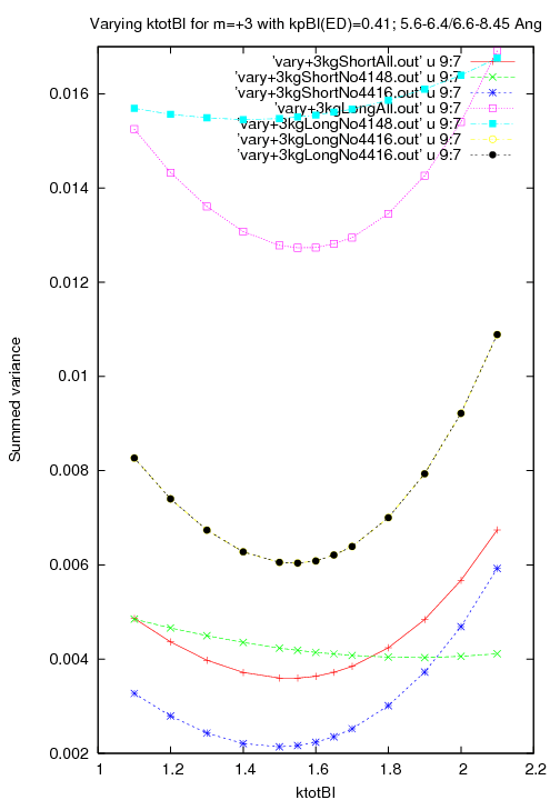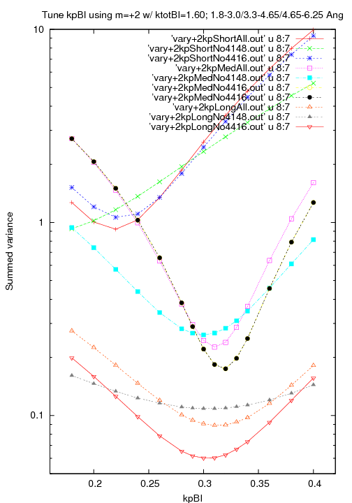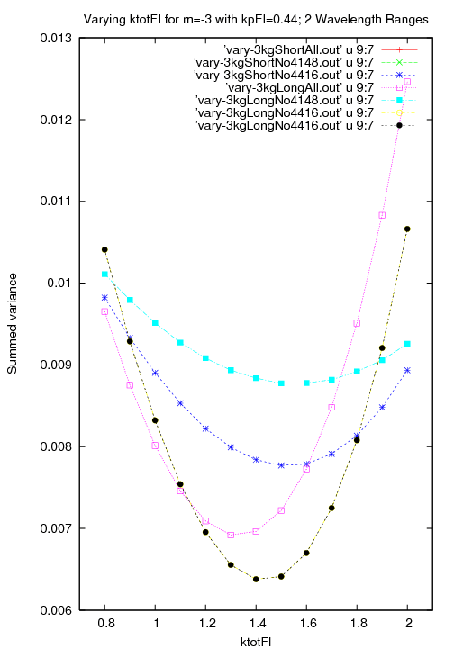 Two wavelength ranges were studied for ktot and three for kp in order to look for energy dependence. Summed variances are plotted in Figs. 1-4, with comments in the captions. Variances were computed using data from all 5 observations, and usually also when excluding ObsID 4416 (to remove the data with the largest statistical uncertainties and therefore most likely to have outliers) or ObsID 4148 (the highest rate observation, with the largest pile-up corrections and therefore most likely to exhibit deficiencies in the correction method). The "No4416" cases often improved constraints on the pile-up parameters, while the "No4148" cases usually just reduced the sensitivity, as one would expect. The choice of best parameter values was somewhat subjective but usually weighted most heavily toward the results using all the data. (In the quick and dirty plots below, yellow and black data points trace the same data.)