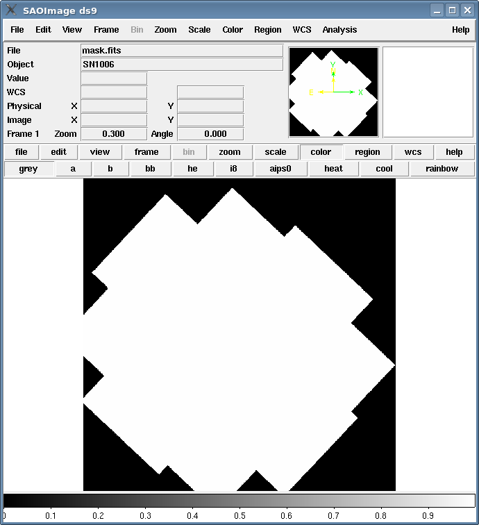 unix% dmimgthresh infile=expfile_flat.fits outfile=mask.fits cut=1 value=0