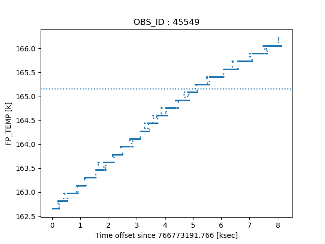 Assuming our source of interest has emission and/or absorption features, lands on a front-illuminated chip and has between 500-2500 counts then we'll want to filter out data warmer than -108 C (165.15 K) for this observation (see synopsis above). For roughly the first 5 ksec the FP_TEMP value is colder than this limit of 165.15 K and events in this time window are less affected by uncertainties in spectral response associated with warm focal plane temperatures.