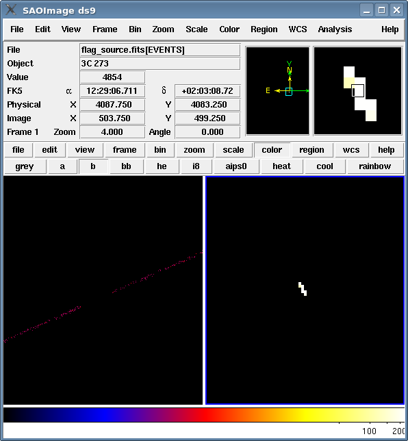 ![[Print media version: The background and source photons flagged by the tool are displayed side-by-side in ds9.]](flagged.png)