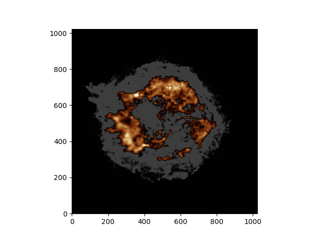 The "heart" color look-up table from ImageJ being used in matplotlib. The input file was created by applying an asinh transform to a smoothed image from the event file using dmimgcalc.