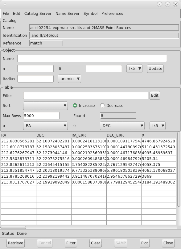 There are many things that can be done with the data once it has been converted to catalog format and loaded into ds9. The symbol editor can be used to create very complex annotations, properties can be plotted, and with a SAMP hub running, the data can be shared among various other Virtual Observatory applications including topcat.
