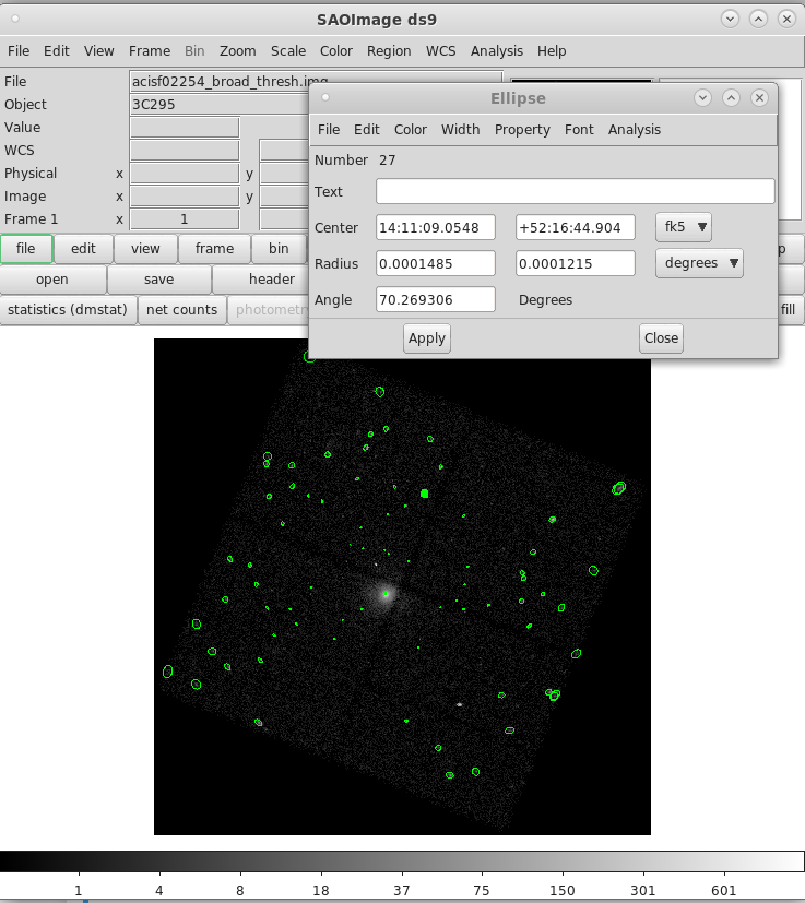 Once the source list is overlaid on the image, you may see some sources that you want to exclude from the analysis. Currently, ds9 does not number the sources in the field of view. However, double-clicking on a source region brings up the region info box, which lists the region "ID". In Figure 2, the source on the left side of the field of view was chosen - the ID is 12. This number corresponds to the row the region occupies in the FITS file.