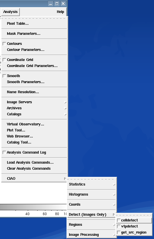 The "Analysis" menu has several features which are useful in the analysis of Chandra data. The following examples illustrate how to apply contours, retrieve Digital Sky Survey data, perform comparative analysis of the two datasets, and define custom analysis functions. There is information on each of the commands used in these examples in the ds9 manual: