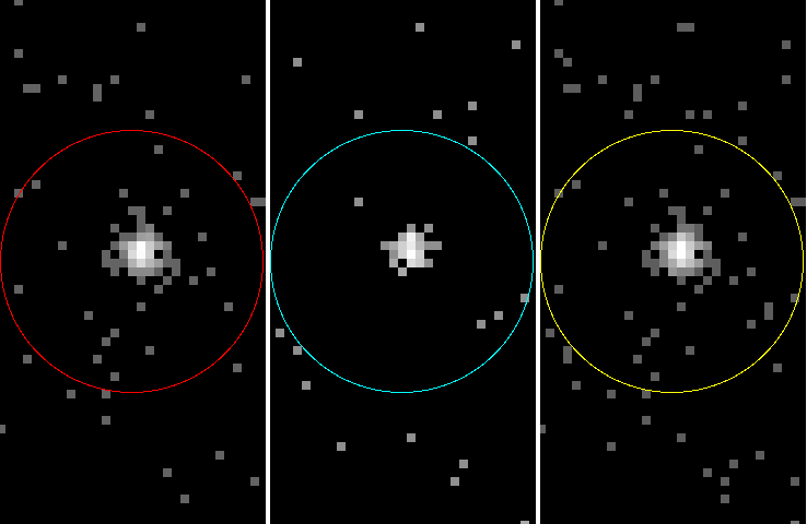 The right most frame is for OBSID 22033 which clearly has the most counts. From the find_chandra_obsid output above, we also know that it was the shortest observation (11.9ksec). This change in brightness is consistent with the srcflux results.