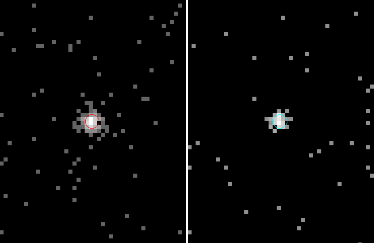 We can see that the difference in the centroid location is much, much less than a pixel (0.492 arcsec) so applying a fine astrometric correction is not necessary for this source.