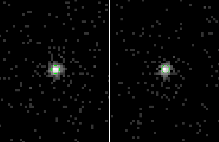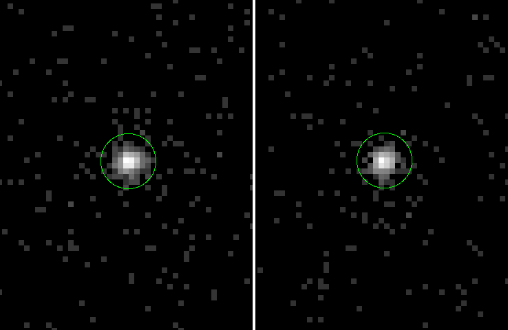 Unfiltered counts images of OBS_ID 13899 (left) and OBS_ID 15575 (right). The images have been zoomed to 8 and aligned on world-coordinates (wcs).