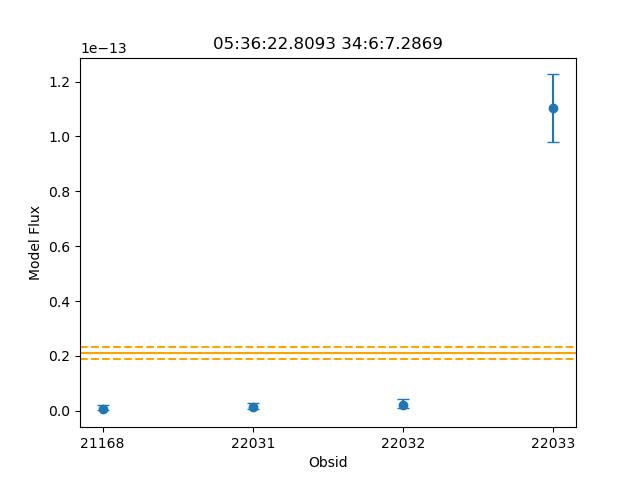The source shown in Figure 13 looks to be variable. The model flux increases significantly during OBS_ID 22033. We can take a look at the source in each of the OBS_IDs to see if this results makes sense. The images are shown in Figure 14.