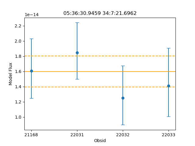 The model flux in each individual OBS_ID with the 1-sigma confidence limits. This is the source identified as "0010" in the srcflux verbose output. The solid horizontal line is the Model Flux computed for the merged data, the dashed horizontal lines are the 1-sigma confidence limits.