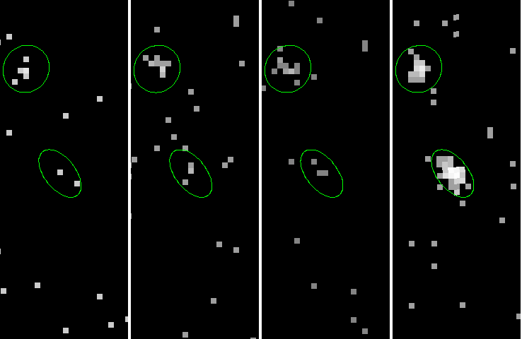 The unfiltered counts images for (left to right) obsid 21168, 22031, 22032, and 22033. The variable source shown in Figure 13 is at the center of each frame.