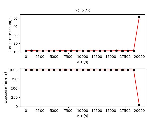 The Dead Time Factor (DTF) was included when creating this lightcurve. Note that the final time bin has a very low exposure value (bottom plot). This leads to an anomolously high count rate (top plot).