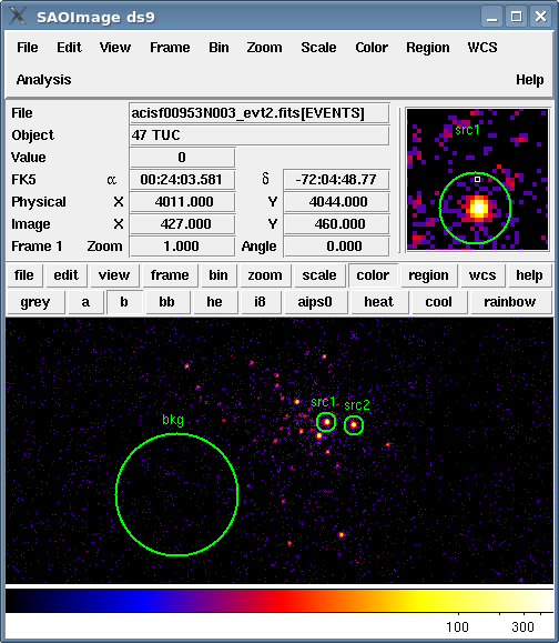 To begin, we define the regions - two source and one background - which will be used to create the lightcurves. For instructions on how to create regions in ds9, see the Using CIAO Region Files thread. The regions used in this example are shown in Figure 1.