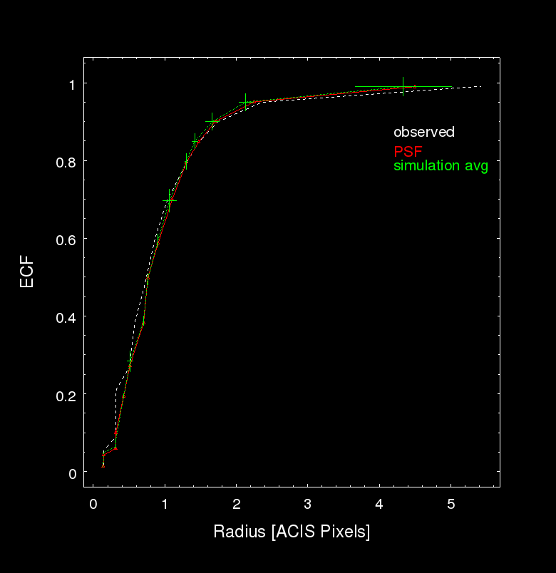 The ecf_calc tool is applied on the observed and simulated events files to obtain the ECFs from a circular region, 8.2 sky pixels in radius, centered on the source position in sky coordinates. The profile is binned to match the earlier analysis of 0.2 pixels.