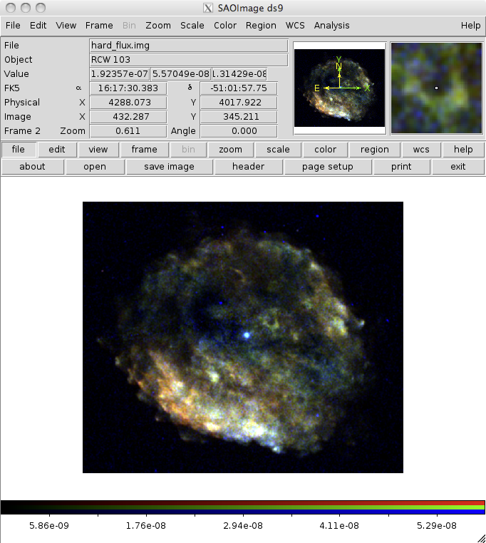 unix% ds9 -scale log -smooth -cmap b rcw103/broad_thresh.img rcw103/broad_thresh.expmap -scale linear