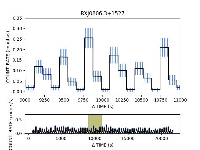 Light curve for RXJ0806.3+1527 binned at 20sec resolution. The top plot is a zoomed in view of the highlighted part of the full lightcurve shown in the bottom plot. The python commands to create the plot using matplotlib are shown below:
