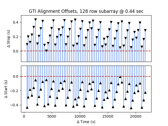 GTI alignment corrections. (Top) shows the correction to the STOP times while (Bottom) shows the correction to the START times. Either side is shifted by upto 0.44 (TIMEDEL) seconds. The following bit of Python can be used to plot the results