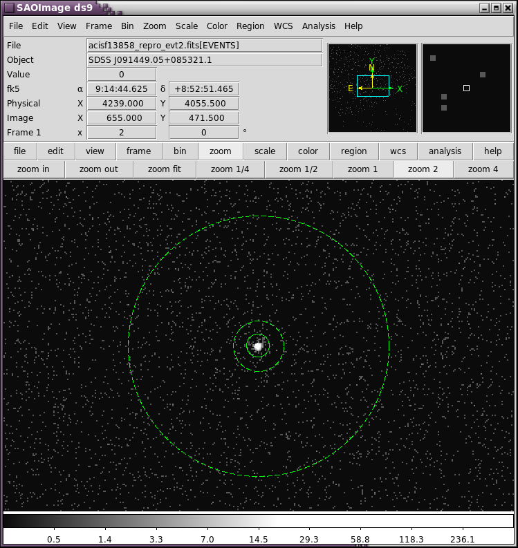 unix% cat src.reg # Region file format: DS9 version 4.1 global color=green dashlist=8 3 width=1 font="helvetica 10 normal roman" select=1 highlite=1 dash=0 fixed=0 edit=1 move=1 delete=1 include=1 source=1 fk5 circle(9:14:49.090,+8:53:21.231,4.083") unix% cat bkg.reg # Region file format: DS9 version 4.1 global color=green dashlist=8 3 width=1 font="helvetica 10 normal roman" select=1 highlite=1 dash=0 fixed=0 edit=1 move=1 delete=1 include=1 source=1 fk5 annulus(9:14:49.074,+8:53:20.987,9.064",46.425") # background