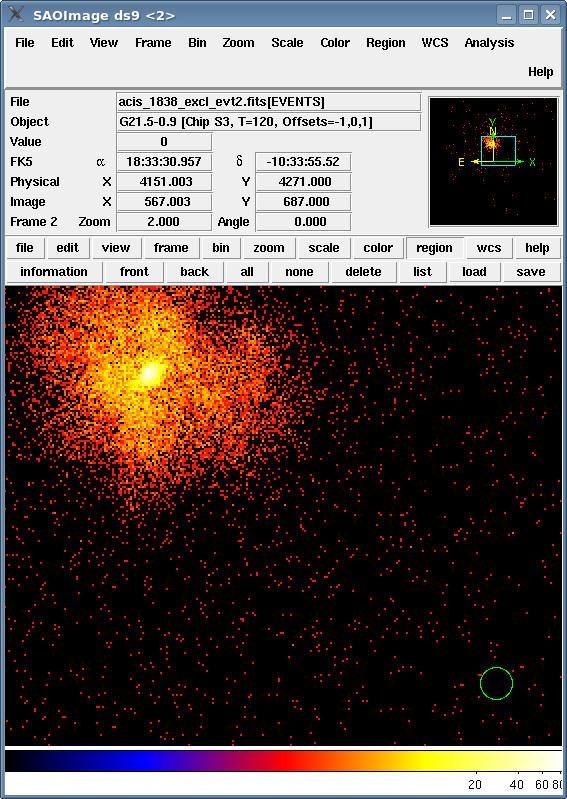 This command creates a new event file with the point source removed (Figure 5). Use this event file in the rest of the radial profile analysis. This is not an issue in this example, so we continue using acis_1838_evt2.fits.