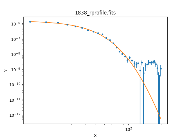 unix% sherpa sherpa> load_data(1,"1838_rprofile.fits", 3, ["RMID","SUR_BRI","SUR_BRI_ERR"]) sherpa> set_source("beta1d.src") sherpa> src.r0 = 105 sherpa> src.beta = 4 sherpa> src.ampl = 0.00993448 sherpa> freeze(src.xpos) sherpa> fit() Dataset = 1 Method = levmar Statistic = chi2 Initial fit statistic = 4.24792e+11 Final fit statistic = 221.594 at function evaluation 30 Data points = 38 Degrees of freedom = 35 Probability [Q-value] = 5.65854e-29 Reduced statistic = 6.33127 Change in statistic = 4.24792e+11 src.r0 134.119 +/- 0 src.beta 4.6542 +/- 0.0351998 src.ampl 1.51907e-06 +/- 1.70734e-08 sherpa> plot_fit(xlog=True, ylog=True)