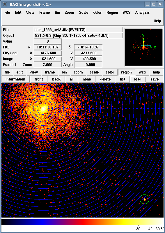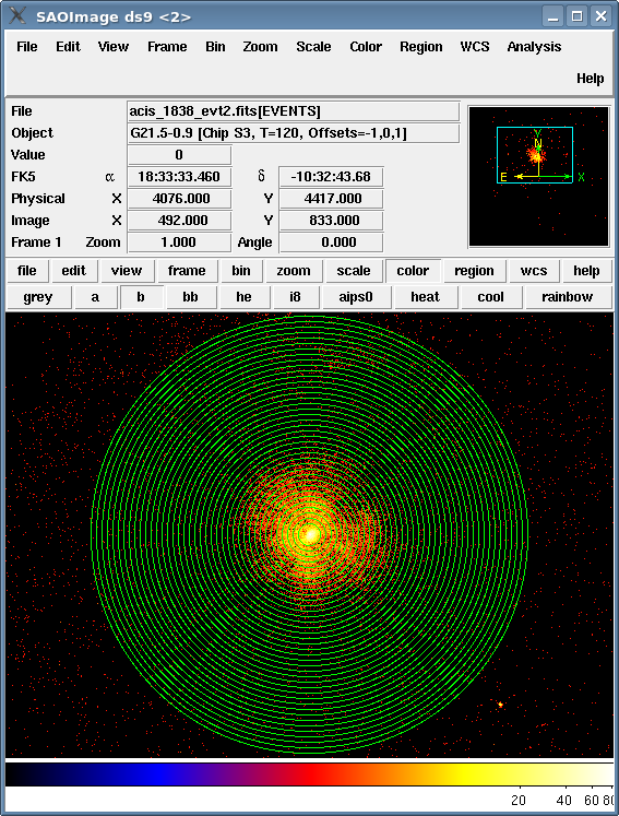 A region editing window (Figure 1) will appear, in which one can adjust the number of annuli and their sizes. Thirty-eight equally-spaced annuli, with minimium and maximum of 10 and 200 pixels respectively, which are located around (but exclude) the core of G21.5-09, are shown in Figure 2.