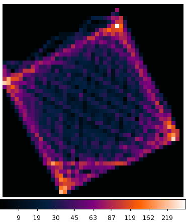 The aspect histogram converted into a 2D image. The X-axis is offset in RA and the Y-axis is the offset in Declination. The pixel value is the total duration at each RA and Dec offset. The data have been integrated over the 3rd dimension, Roll, which typically all fall into a single aspect histogram bin.
