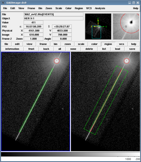 The streak region is defined with a rectangle (see this FAQ on how to rotate shapes in ds9); the acis_streak_map tool is another method that may be used to create the streak region file. The background region is a wider rectangle which excludes the source region. The two regions are shown in separate frames in Figure 1. The on-axis source region is shown in red in both frames