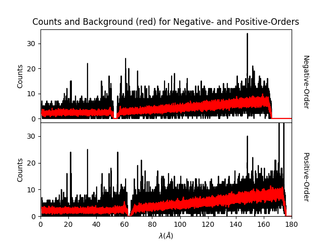 Now we populate the lower plot with the plus-order counts and background spectra in the same manner