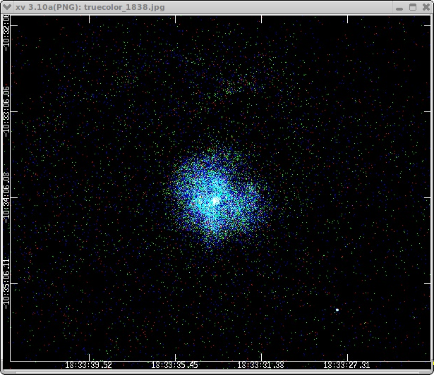 unix% punlearn dmimg2jpg unix% pset dmimg2jpg infile=soft_img.fits unix% pset dmimg2jpg greenfile=med_img.fits unix% pset dmimg2jpg bluefile=hard_img.fits unix% pset dmimg2jpg outfile=truecolor_1838.jpg unix% pset dmimg2jpg maxred=1 maxblue=1 maxgreen=1 unix% pset dmimg2jpg showgrid=yes unix% pset dmimg2jpg gridsize=60 unix% pset dmimg2jpg fontsize=1 unix% dmimg2jpg Input file name (red image if true color) (soft_img.fits): Green color channel file name (med_img.fits): Blue color channel file name (hard_img.fits): Output jpg file name (truecolor_1838.jpg):