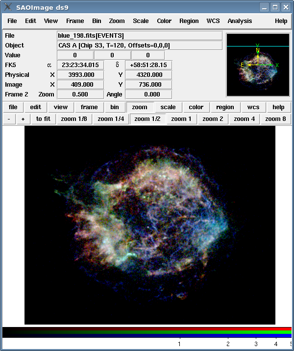 ds9 will open with the three files in one frame, as shown in Figure 1; the "Scale" is set to "log: minmax". The RGB window (Figure 2) should open as well. If it doesn't, open it from the "Frame → RGB..." menu.