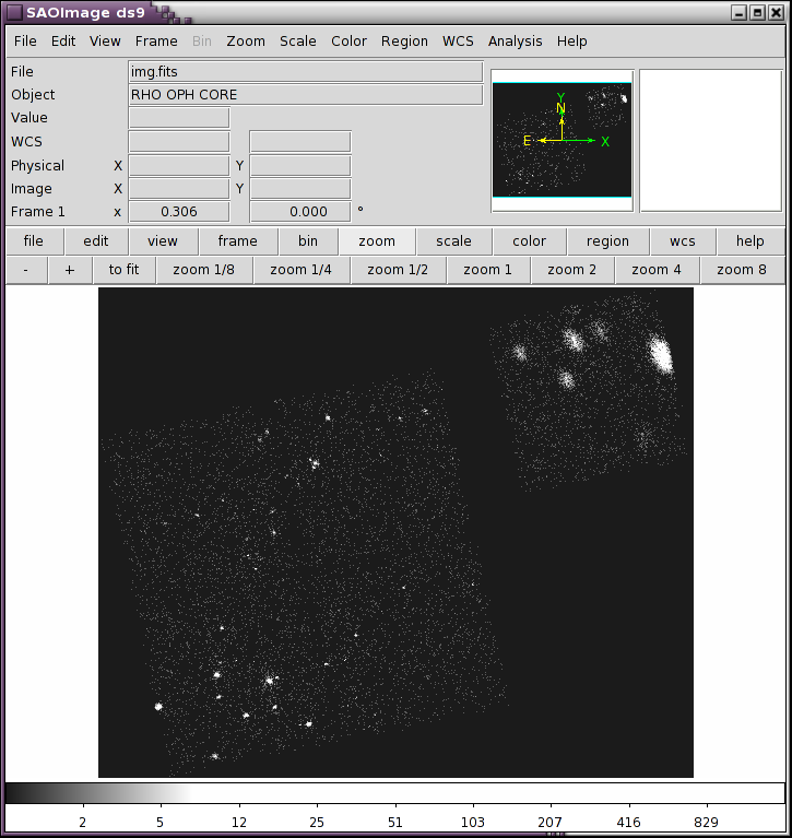 unix% dmcopy "acisf00635N005_evt2.fits.gz[energy=500:7000,sky=region(acisf00635_000N005_fov1.fits.gz)][bin sky=2]" img.fits clob+
