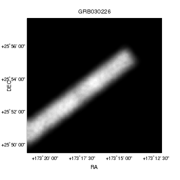 [Print media version: The plot bow shows a band of emission from the bottom left to top right (a rotated rectangle), where the emission is a mottled white color, fading to gray at the edges. The remaining area is black. THe axes are labelled as RA and DEC (X and Y), with both using degrees, minutes, and seconds. The X axis decreases from left to right, because this is Astronomy (and because we are looking out from the inside of a sphere).]