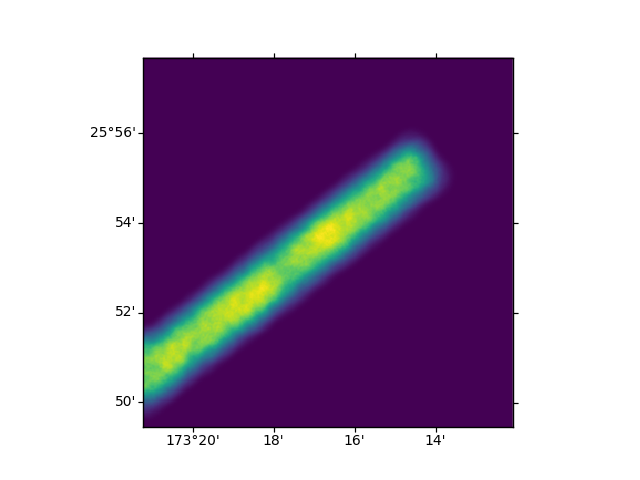 [The plot bow shows a band of emission from the bottom left to top right (a rotated rectangle), where the emission is a mottled white color, fading to gray at the edges. The remaining area is black. THe axes are labelled as RA and DEC (X and Y), with both using degrees, minutes, and seconds. The X axis decreases from left to right, because this is Astronomy (and because we are looking out from the inside of a sphere).]
