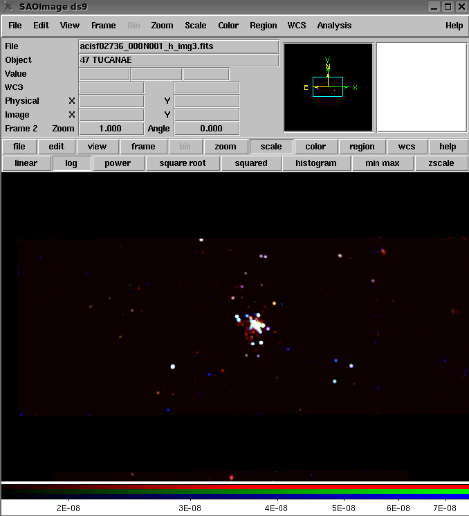 We can make a source significance cutoff in a number of ways with CSCview; we choose to download and compare the background counts images for the ObsIDs in our list, to find one with a smooth, low background. (See also the CSC significance source properties 'o.detect_significance', 'o.flux_significance', and master 'significance'.) We can examine and analyze the downloaded background images with SAOImage DS9, e.g. with the DS9 menu items "View-->Horizontal/Vertical Graph" and "Analysis-->Pixel Table".