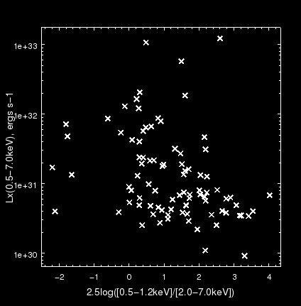 Before submitting the completed query, we set the "Edit-->Preferences-->Output Coordindate Format" preference to "decimal", so that the RA and Dec values in the search results table each occupy one, not three, columns; this will make the save file of results easier to manipulate with analysis tools later. After submitting the query with the "File-->Search", we save the table of source data to a text file by selecting "File-->Save" while the Results tab is open. In the section "Analyzing CSC source data with CIAO, Sherpa, and ChIPS" we use the plotting program ChIPS to plot our sources in X-ray color-magnitude space.