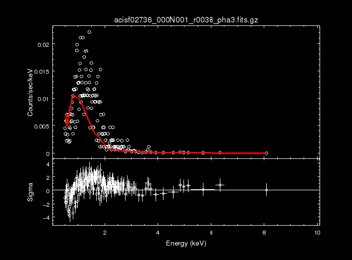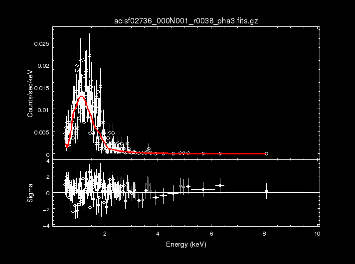 sherpa> load_pha(2, "acisf02736_000N001_r0038_pha3.fits.gz") sherpa> subtract(2) sherpa> group_counts(2, 1) #require minimum of 1 count per bin sherpa> ignore() sherpa> notice(0.5, 7.0) sherpa> set_model(2, abs1*xsbbody.b1) sherpa> abs1.nh = 1e-07 sherpa> abs1.nh.max = 0.001677 sherpa> b1.kT = .2963 sherpa> b1.kT.max = .3009 sherpa> b1.kT.min = .2918 sherpa> show_model(2) Model: 2 apply_rmf(apply_arf((58519.8509903 * (xsphabs.abs1 * xsbbody.b1)))) Param Type Value Min Max Units ----- ---- ----- --- --- ----- abs1.nh thawed 1e-07 0 0.001677 10^22 atoms / cm^2 b1.kt thawed 0.2963 0.2918 0.3009 keV b1.norm thawed 1 0 1e+24 L39 / (D10)**2 sherpa> fit(2) Dataset = 2 Method = neldermead Statistic = chi2xspecvar Initial fit statistic = 2.66444e+15 Final fit statistic = 315.675 at function evaluation 567 Data points = 164 Degrees of freedom = 161 Probability [Q-value] = 4.03846e-12 Reduced statistic = 1.96071 Change in statistic = 2.66444e+15 abs1.nh 0.001677 b1.kt 0.3009 b1.norm 4.73533e-07 sherpa> plot_fit_delchi(2)