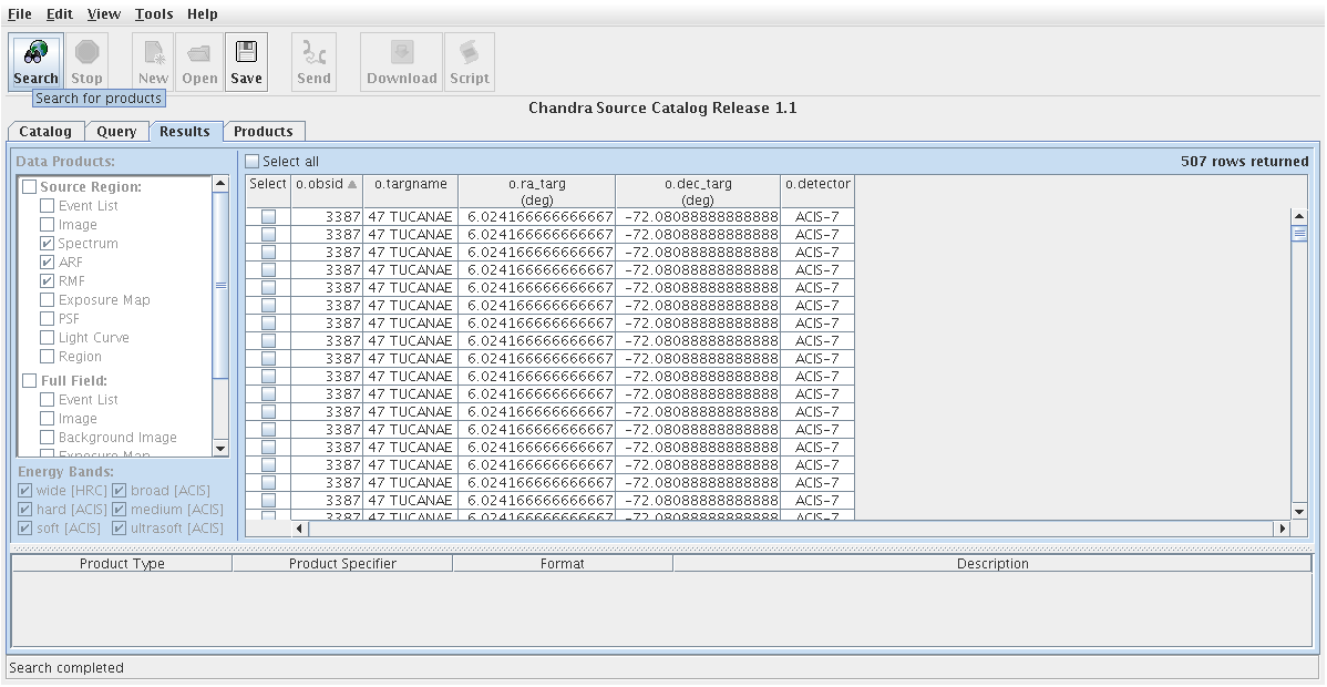 Figure 7. List of selected CSC data products for sources in 47 Tucanae, in the Results and Products tabs