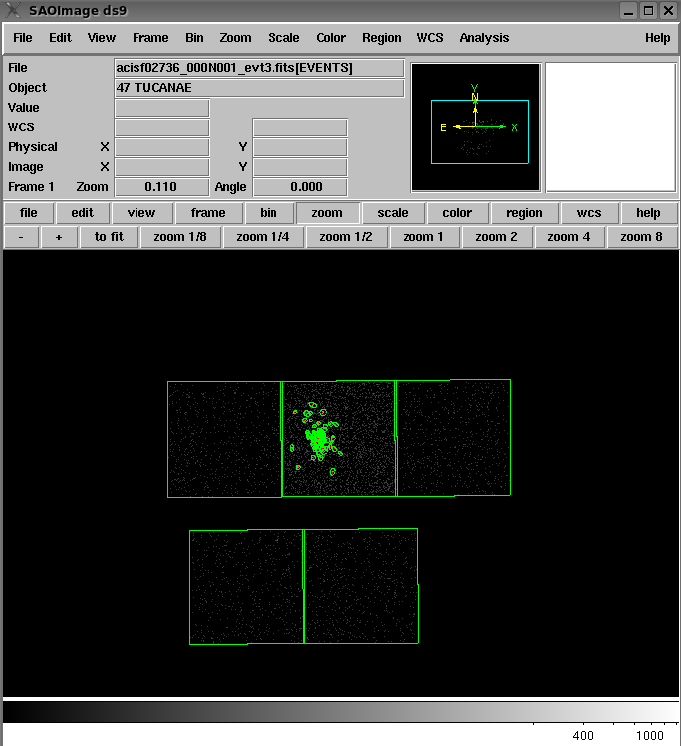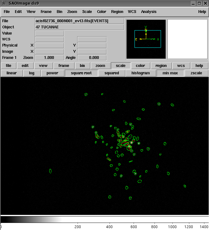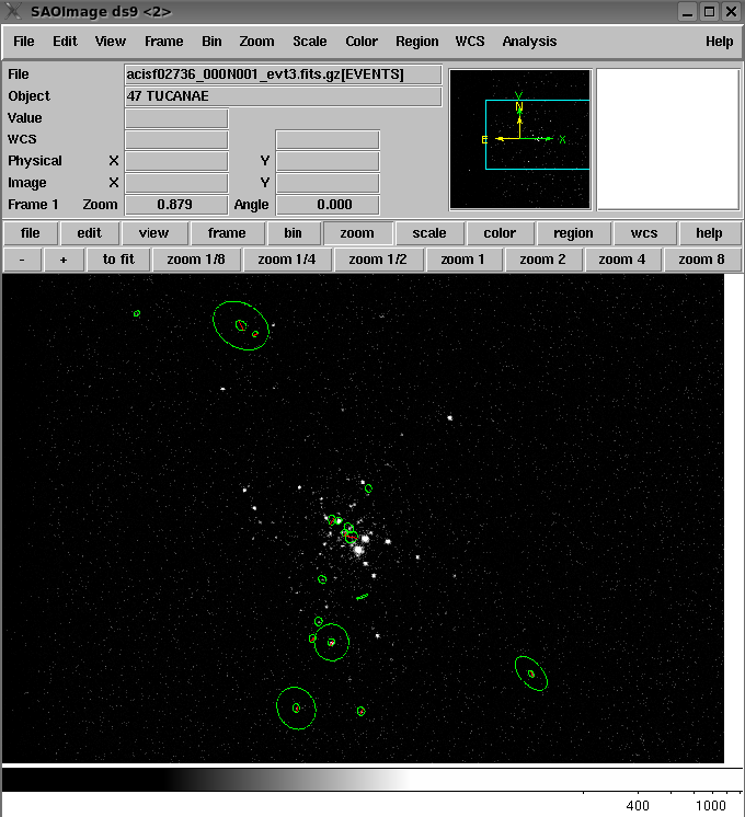 Armed with data products for our sources, we can now visualize all detected source region ellipses overlaid on an events image of the cluster. The Level-3 reg3.fits files we downloaded for each source contain both source and background region descriptions, so we simply compile these regions into one DS9-compatible ASCII file to be loaded into DS9 along with the evt3.fits file for ObsID 2736: