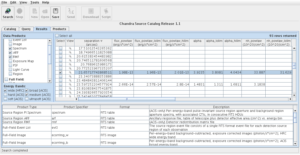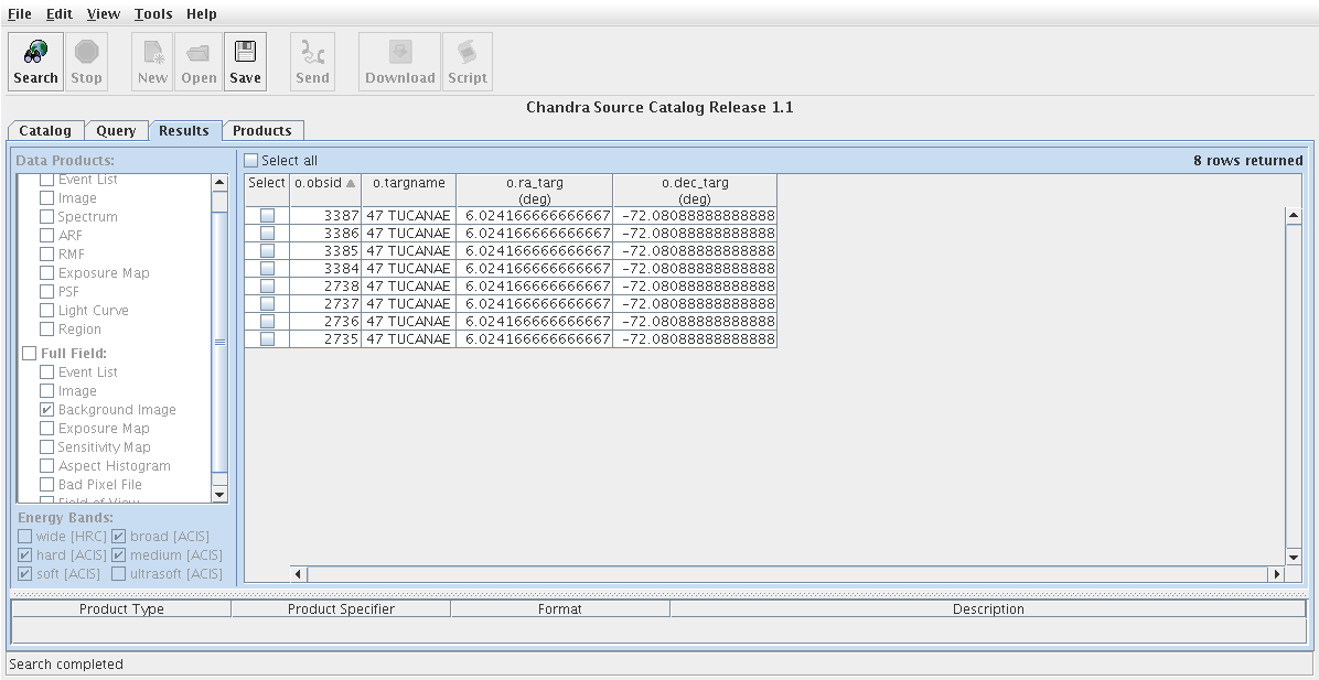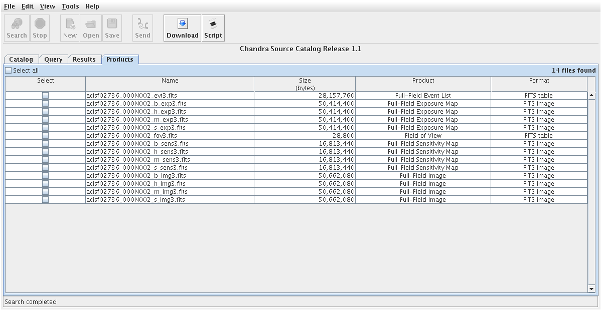 Level-3 data products, such as images, event lists, and spectra, may be downloaded for each source contained in the CSC from the Products tab of CSCview (see the Data Products page for the full list of data files provided by the CSC). To download background images in various science energy bands for each ObsID in our final list, we first re-visit the Query tab and add the 'dataset_id' catalog column to the Result Set window, and re-submit the query (the 'dataset_id' column is used to access data products associated with sources in the catalog). Then, we select the appropriate rows in the resulting query results table in the Results Tab, the desired data products in the Data Products window, then "File-->Search" (see Figure 4). This opens the Products tab, where the list of selected files appear ready for download. Refer to the CSCview thread Retrieving Data Products for details on download options.