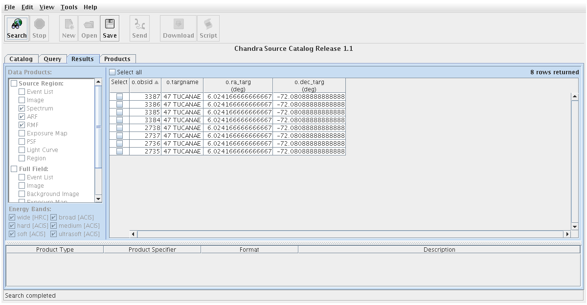 First, we select and download all desired data products for our sources in the Results and Products tabs, respectively, so that we may exit CSCview and begin our analysis with CIAO, ChIPS, and Sherpa.