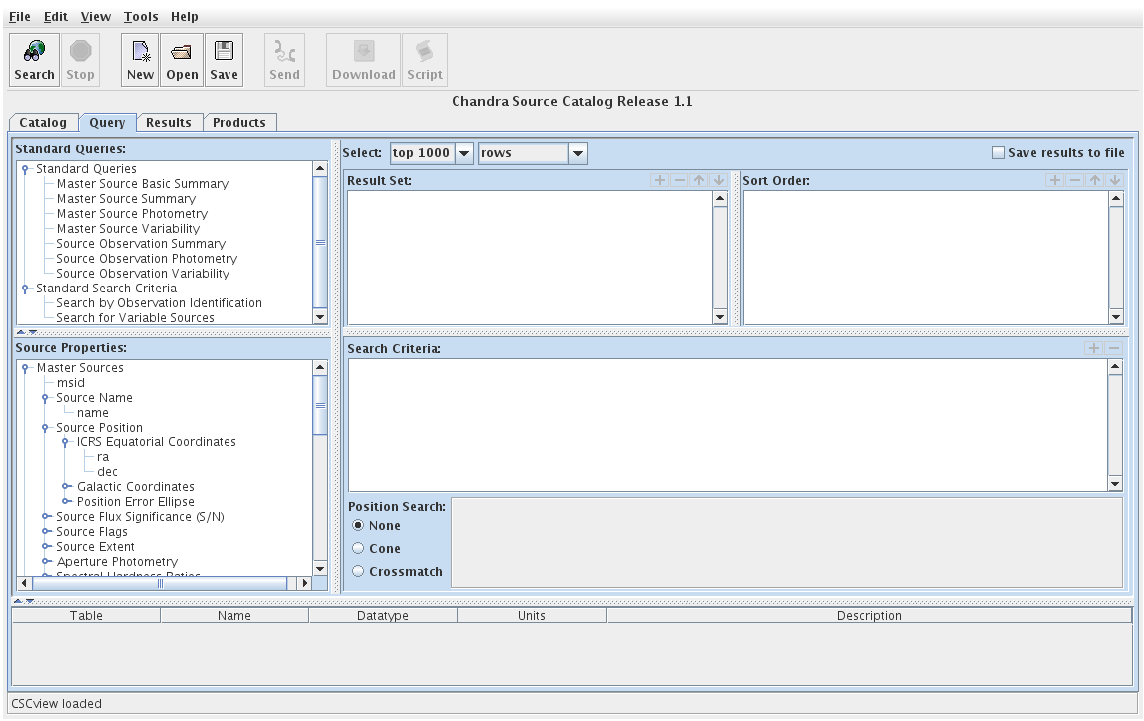 CSCview is launched from a link in the navigation bar of the CSC web pages (CSC homepage: http://cxc.harvard.edu/csc/). CSCview opens on the Query tab, where we may specify our search criteria and desired search results.